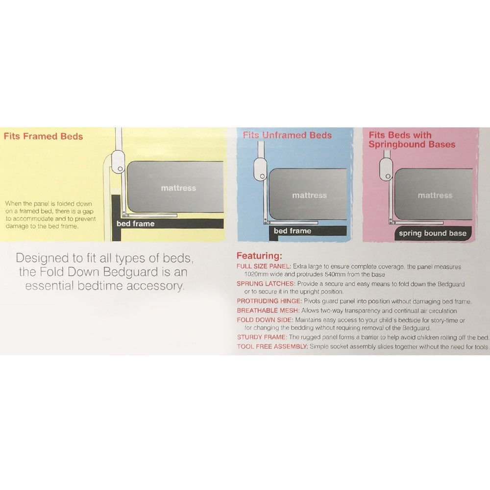 Designed to fit all types of beds, the fold down bed-guard is an essential bedtime accessory.