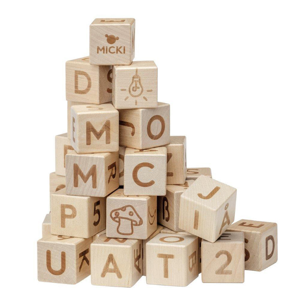 Practice building those first words and creating those first sums with fun and educational blocks from Micki!Designed in Sweden, these 36 wooden blocks are engraved with the numbers and letters on all faces.