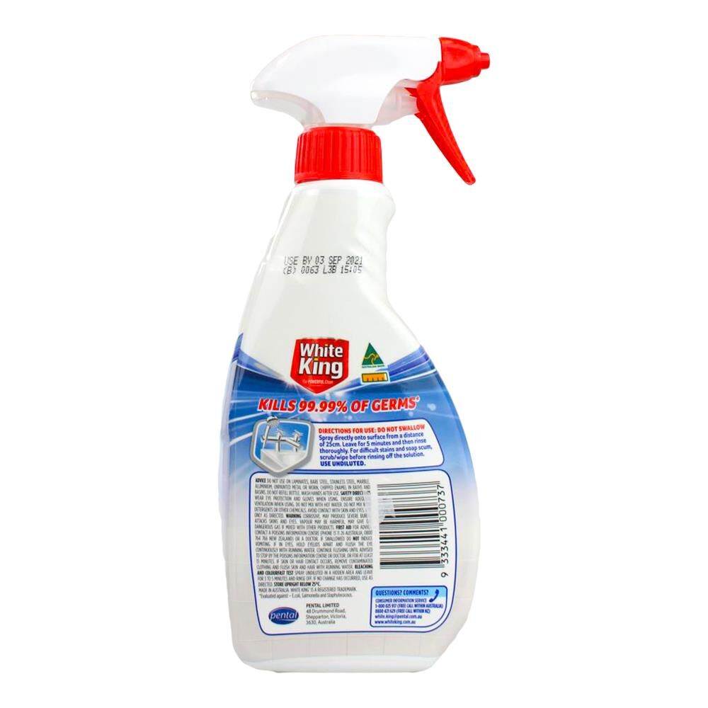 White King Mould & Soap Scum Remover Spray is specially deigned to kill up to 99.99% of germs. This easy spray and rinse formula removes mould and soap scum with ease. Leaving behind a fresh lemony scent. Take the elbow grease out of household cleaning with this foaming spray.