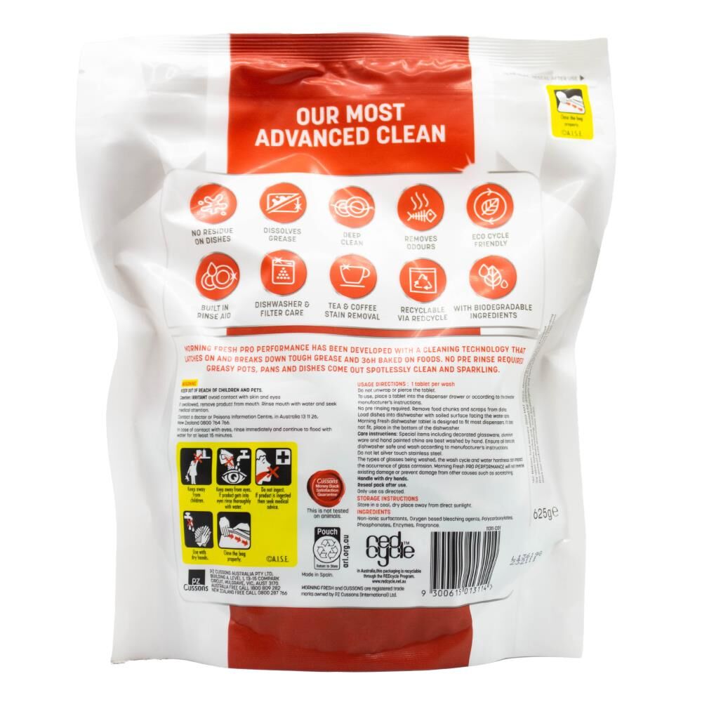 Morning Fresh Pro Performance Dishwasher Tablets have been developed with a cleaning technology that latches on and breaks down tough grease and 36 hour baked on foods. No pre rinse required. Greasy pots, pans and dishes come out spotlessly clean and sparkling. 3x powerful grease cutting actives. Removes 36h dried-on stains. Effective in all wash cycles. No pre rinsing required. No residue on dishes. Dissolves grease. Deep clean. Also available in 30 & 44 tablet packs.