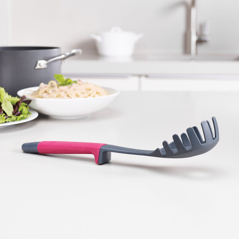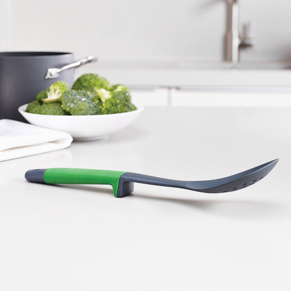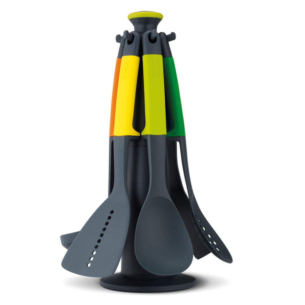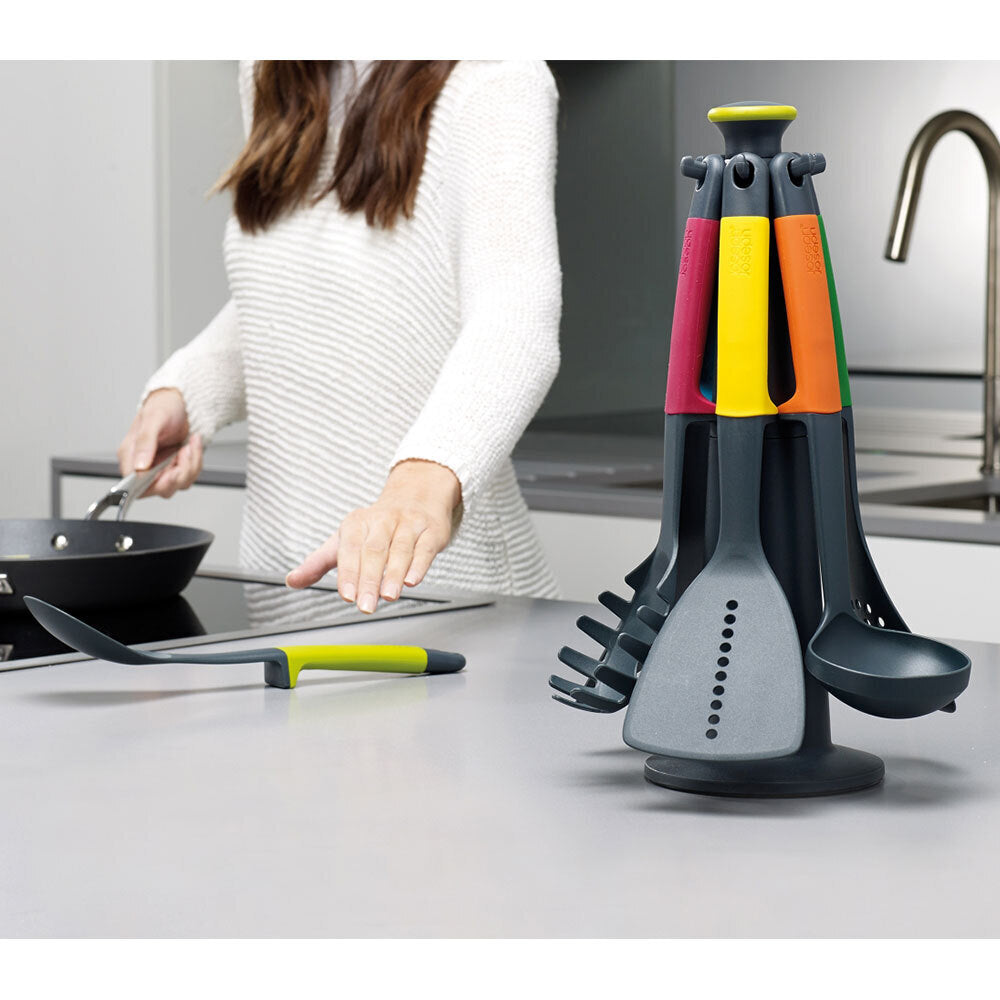 - Set includes: slotted spoon, spaghetti server, solid spoon, slotted turner, flexible turner and ladle