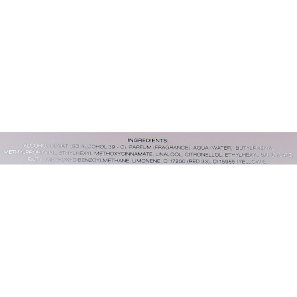 1 x ScentIngredients: Alcohol Denat., Fragrance (Parfum), Water\Aqua\Eau, Geraniol, Linalool, Benzyl Benzoate, Citral, Benzyl Cinnamate, Eugenol, Alpha-Isomethyl Ionone, Citronellol, Limonene, Benzyl Alcohol, Ethylhexyl Methoxycinnamate, Butyl Methoxydibenzoylmethane, Ethylhexyl Salicylate, Ext. Violet 2 (Ci 60730), Red 33 (Ci 17200), Yellow 5 (Ci 19140)