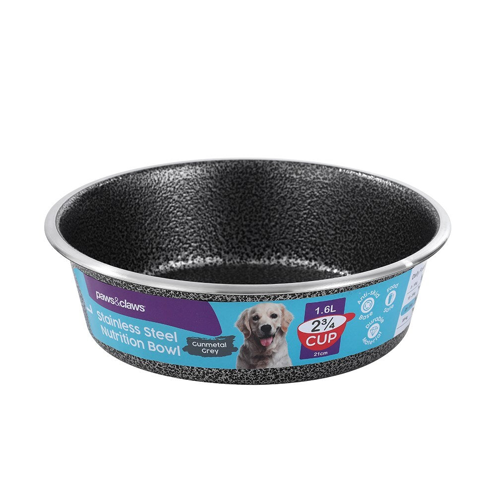 Our Paws & Claws Stainless Steel Speckled Gunmetal Pet Bowl is perfect for your furry friend's dinner time! Made of non toxic stainless steel making it durable and long lasting. Our design features a cool speckled design and a non-slip base to avoid the bowl shuffling around while your pet has their dinner.