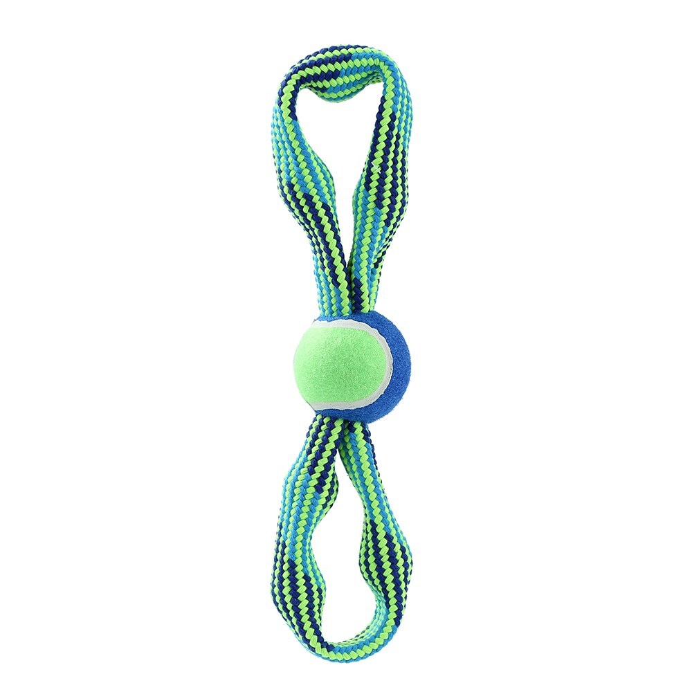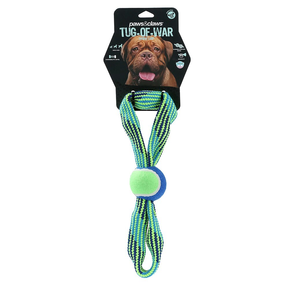 Keep your furry friends entertained for hours with our Paws & Claws Tug-Of-War Double Loop Rope With Tennis Ball and Squeakers! Our design features durable woven rope with a built in squeakers throughout the length of the rope with an attached tennis ball, that is long lasting and is perfect for healthy teeth and gums.