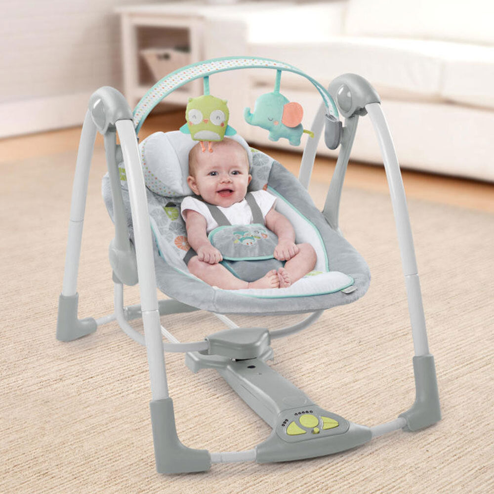 Ingenuity's Swing 'n Go Portable Swing™ provides plush luxury with portable convenience! Neutral pastel colors and ultra-plush padding and fabrics make this baby swing the ideal soothing companion for baby boys or girls. Five swing speeds and three timer choices allow parents to find the perfect swing-time comfort zone for their little one. As infants swing, they are able to relax to eight melodies and three pleasing nature sounds. Innovative Hyberdrive™ technology saves on batteries so baby enjoys longer swing times. The portable swing includes easy-to-clean fabrics and folds flat for easy transport and storage. Five-point harness, sturdy construction, padded head support, and non-slip feet provide the safety features parents demand!