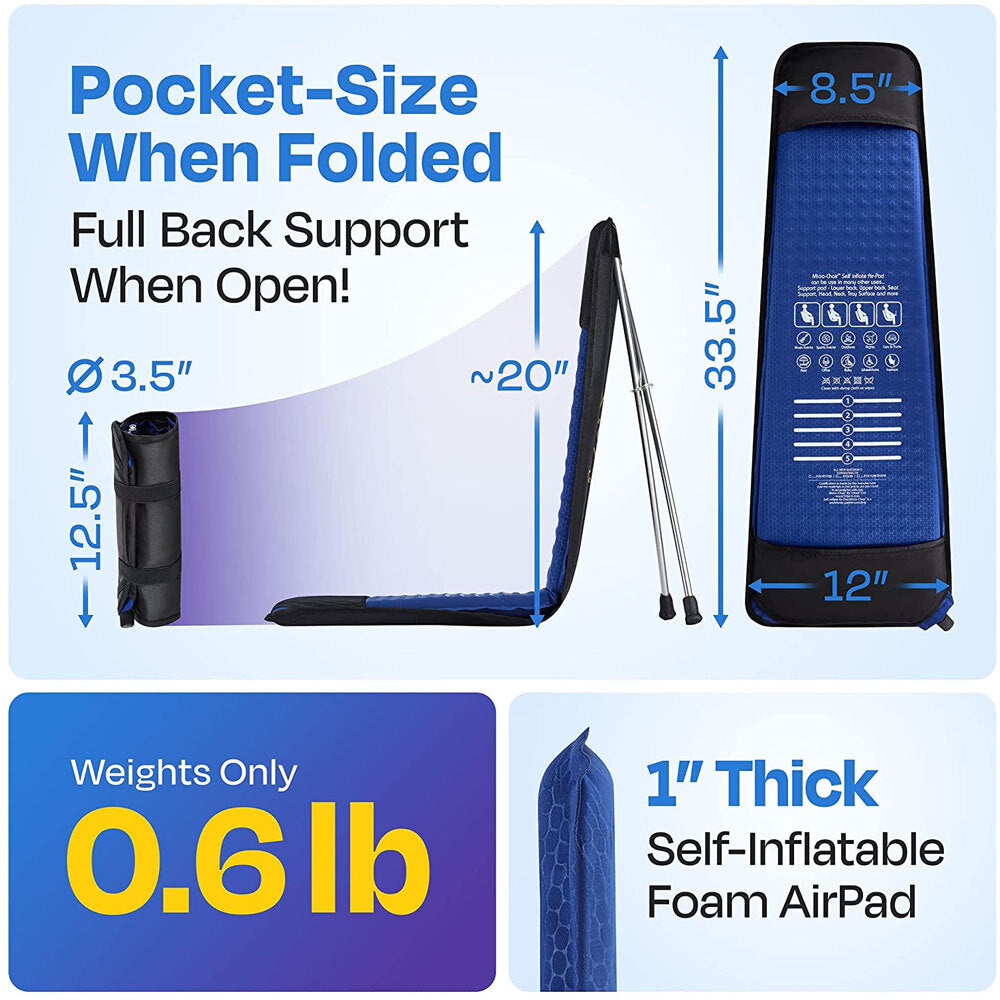 - Self inflated air pad, support-fabric & poles) poles fixture built into fabric chair back: self inflate air pad (on/off air valve system, welded technology)