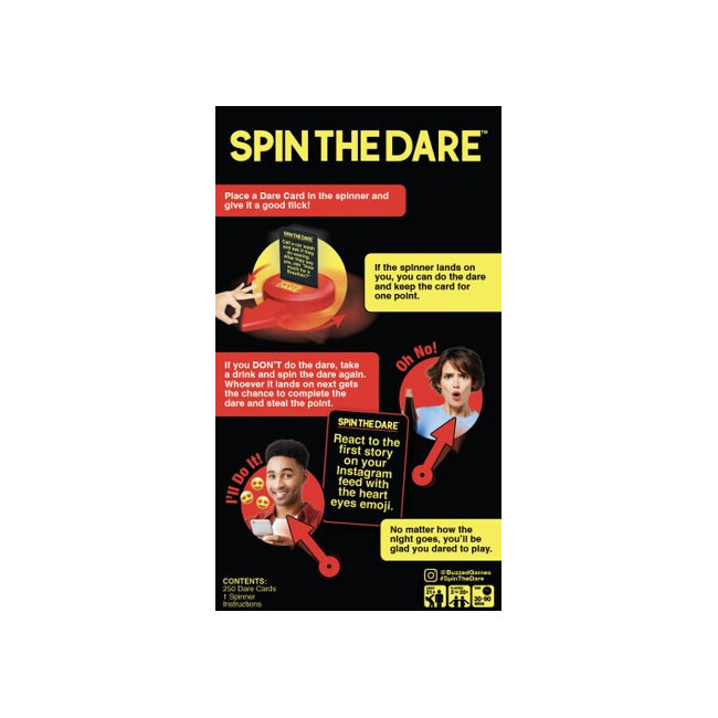Flick the spinner and hope it doesn’t land on you, because whoever it lands on must complete the dare for a point (and bragging rights). If you chicken out, you must drink!
