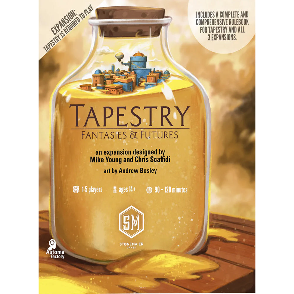 Fantasies & Futures is fully compatible with any combination of the core game, the other Tapestry expansions, and the natural rubber playmat. It is packaged in an eco-friendly, recyclable envelope.