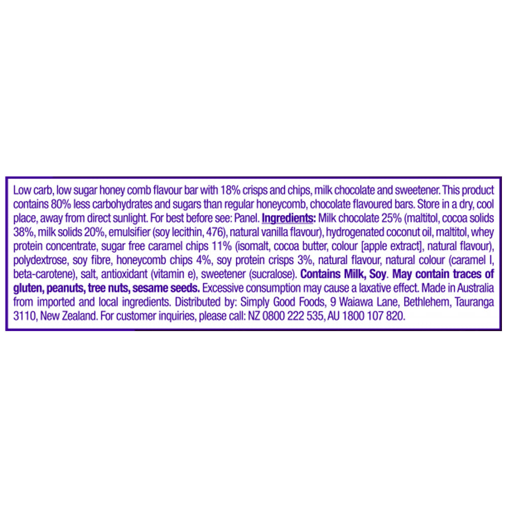Delicious honeycomb fudge covered in milk chocolate and topped with crunchy honey crisps. Treat yourself to this guilt-free indulgence with only 1.5 grams of carbs per bar. With just one bite, it will become your new favourite.