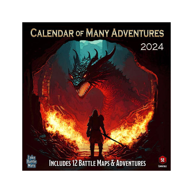 • Wall calendar, one month per page with a 12”x11” battle map for every month and 12 5E adventures to play on them