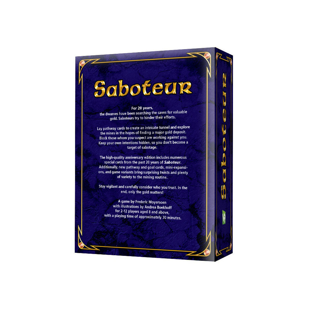 The high-quality anniversary edition includes numerous special cards from the past 20 years of Saboteur. Additionally, new pathway and goal cards, mini-expansions, and game variants bring surprising twists and plenty of variety to the mining routine.