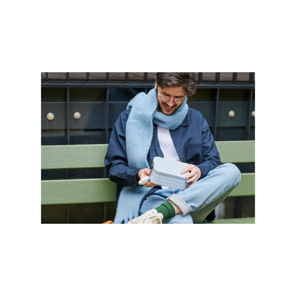 Lunch box Take a Break Midi in the colour Nordic black. Includes separate bento boxes. Leftovers from last night's dinner? Pack them for lunch in the Take a Break. With two separate compartments, plus an extra box with a fork, the bento in your lunch box will make sure your lunch stays deliciously fresh! Create endless combinations of your favourite foods in the Take a Break bento. Where and when you eat them is up to you! This lunch box with bento boxes is very robust and has a distinctive, quirky look. The bento boxes inside the lunch box can be used in the microwave (without their lids). Perfect for combining a variety of small dishes, so you can enjoy a different lunch every day! Lunch box for 4 sandwichesIncluding removable bento trayBento trays are allowed in the microwave