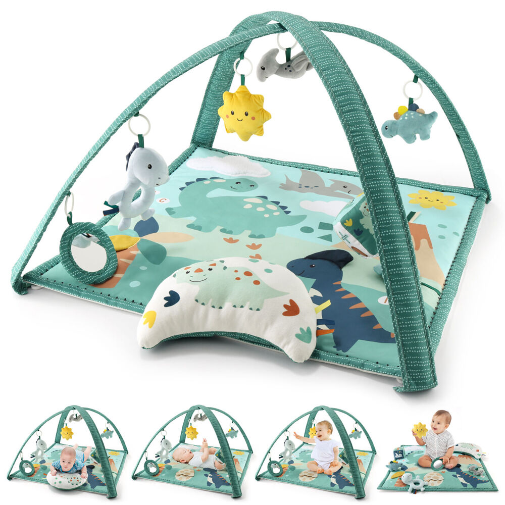 Our 7-in-1 Dino Play Gym is a versatile activity center, designed to captivate your little one. Featuring adorable dinosaur-themed artwork with a prehistoric array of sounds, shapes, and textures sure to engage baby's attention for hours of educational play. This multi-function activity mat supports motor skills, sensory exploration, and cognitive development with thoughtful interactive features such as a mirror, plush dino toys, rattle, crinkle, bell, fidget ribbons, and pillow. From tummy time to sitting up play stages, its foldable design makes it travel-friendly and space-saving. The soft, machine-washable fabric ensures simple maintenance while a non-skid backing guarantees it stays in place for endless hours