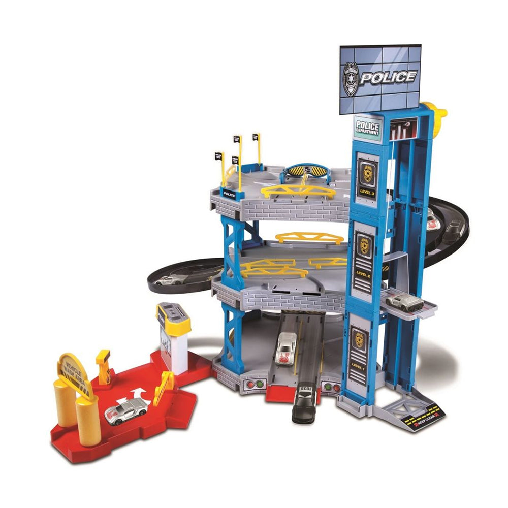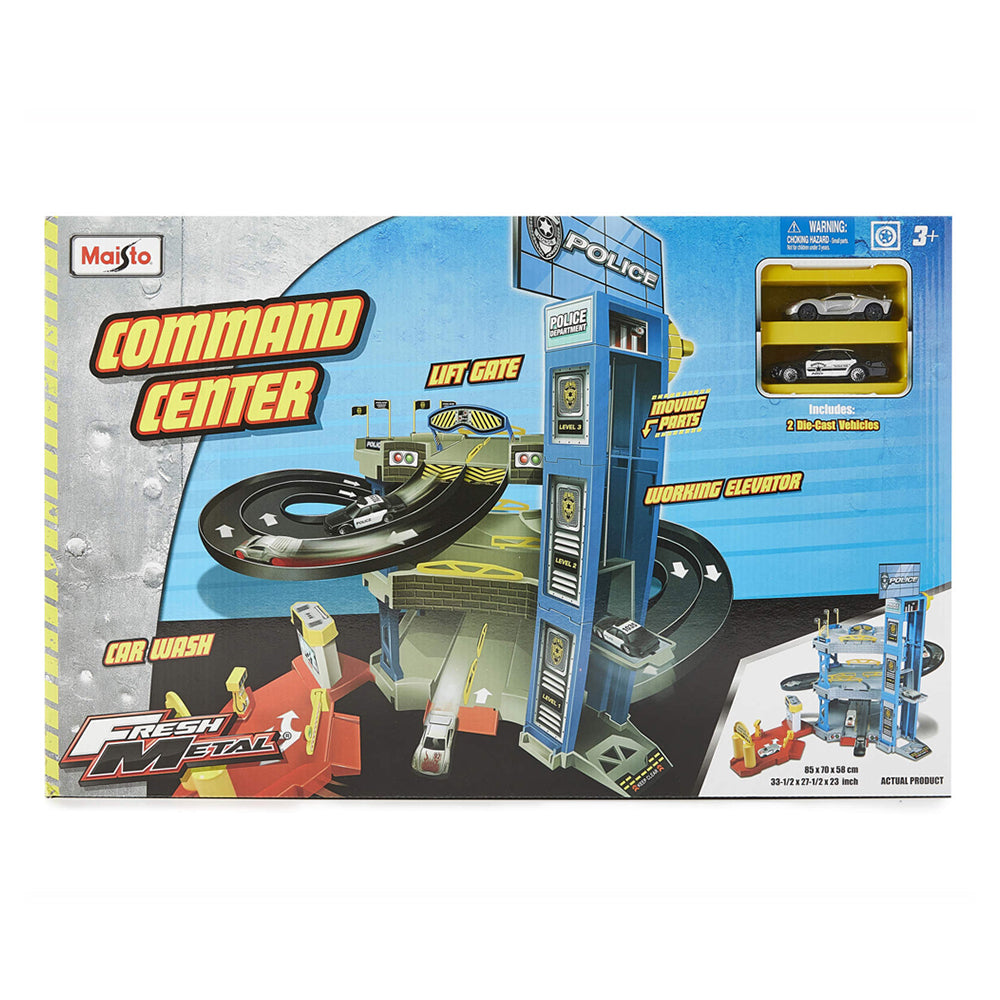 Race to the bottom to save the city with this police command center playset! Three levels of play features a working elevator that sends the included die-cast vehicles up and down, then race down the double lane ramp.