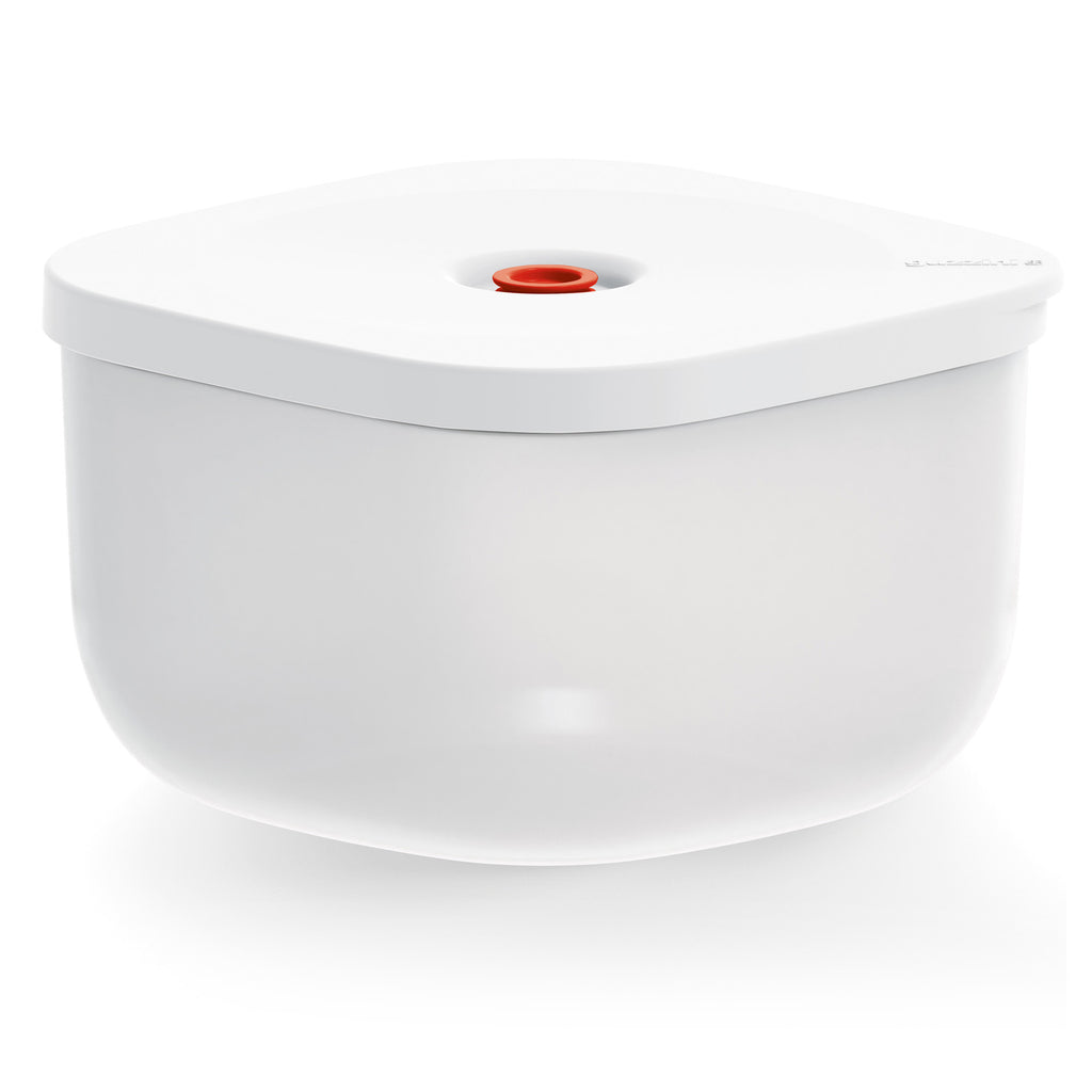 The containers, in high-grade plastic, have opaline white body and white lid with silicone air removal valve: it takes just a few seconds’ suction to create a perfect vacuum. Dishwasher-friendly, all containers can be used in the microwave without lid, in the refrigerator and even in the larder at room temperature. What’s more, in vacuum mode their seal is perfect: no liquid leaks.