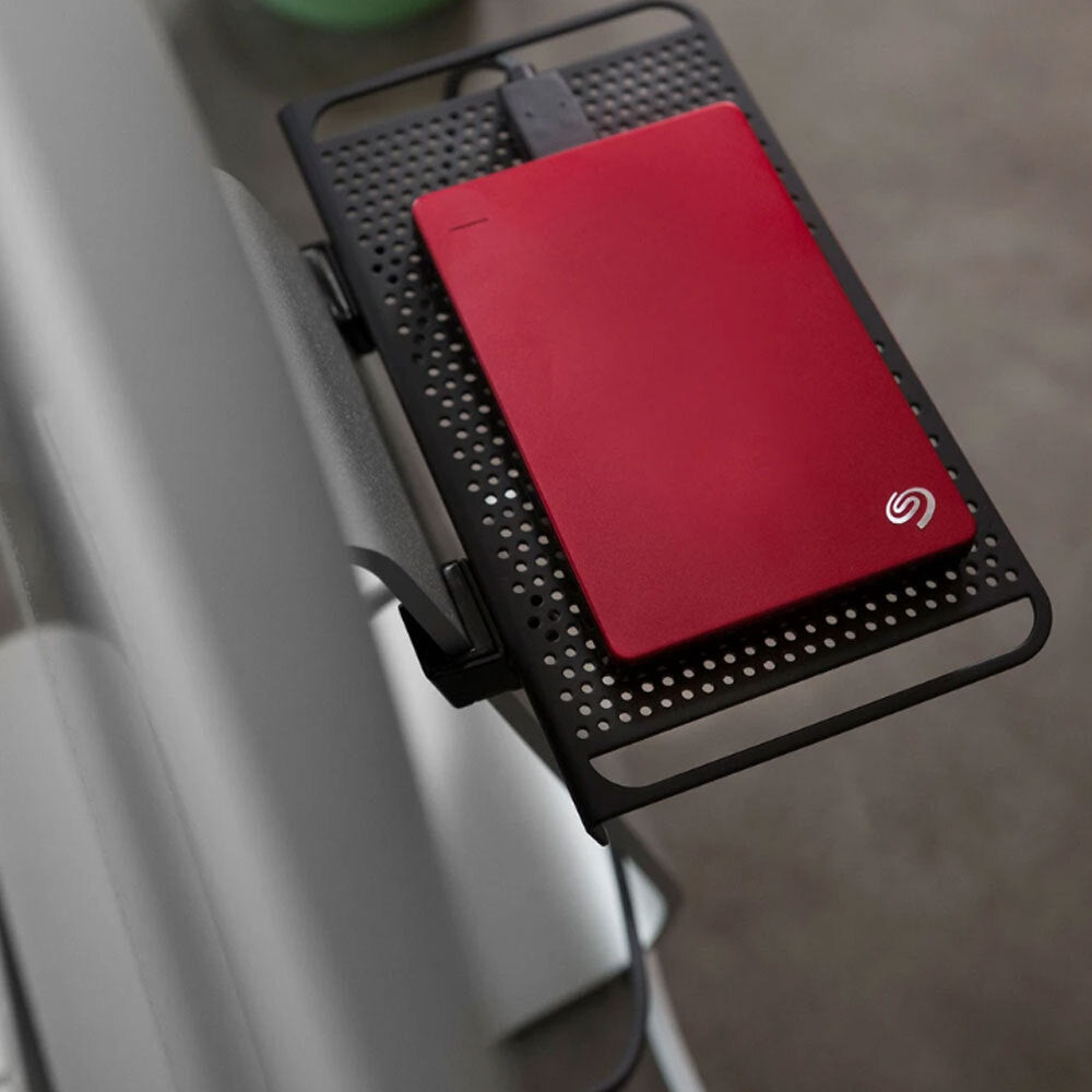 It is the perfect place to park portable hard drives or other USB peripheral you want to hide, but need easy access to every now and then. Set your USB hub on the shelf and tie your cables to it for a super tidy workspace.