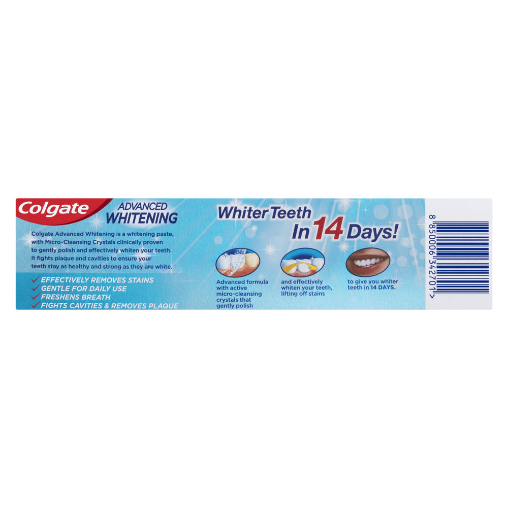 Colgate Advanced Whitening Toothpaste is a teeth whitening paste with active Micro-Cleansing Crystals, clinically proven to gently polish and effectively whiten your teeth.