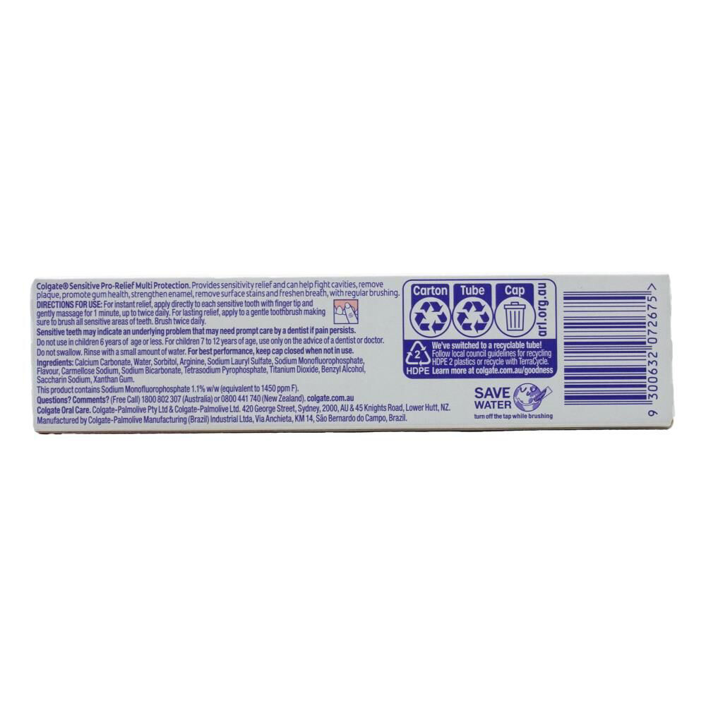 Colgate Sensitive Pro-Relief Multi-Protection Toothpaste contains Clinically Proven Pro-Argin technology which plugs the tubules in dentine that lead to sensitivity pain. With regular brushing, it can help fight cavities, remove plaque, promote gum health, strengthen enamel, remove surface stains and freshen breath.