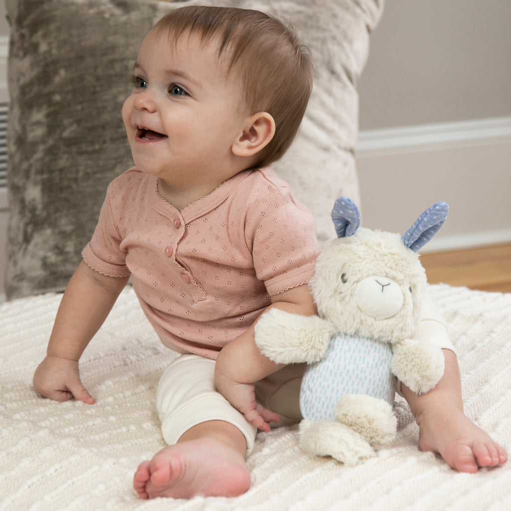The Sylvi Squeak Toy from Ingenuity responds to baby’s every hug. The gentle squeaker sound will surprise your infant when it chimes from this sweet stuffed animal. The easy-to-grasp plush toy is ready for cuddles and comfort whenever you need to soothe baby, and it fits easily in the diaper bag for on-the-go hugs. As part of the hippity hopping Sylvilagus family, Sylvi the bunny rabbit keeps baby company while you jump from task to task.