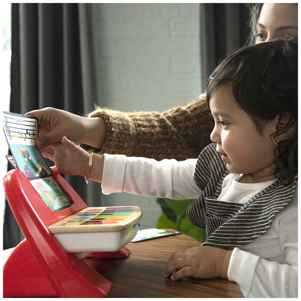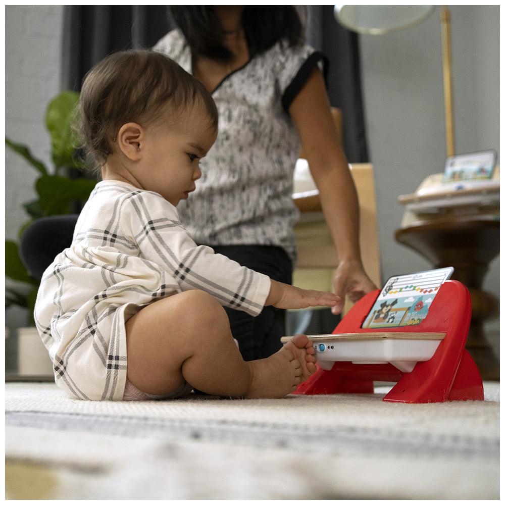 Baby Einstein Cal’s First Melodies Magic Touch Piano introduces babies to classic melodies on this wooden keyboard featuring Magic Touch technology. With three color-coded music cards, little ones can play popular melodies in the musical sound of their choice by following the dots on the cards. Pressing the blue Einstein button activates set melodies, or babies can freestyle with different piano key sounds to discover cause and effect while creating their own special tunes.