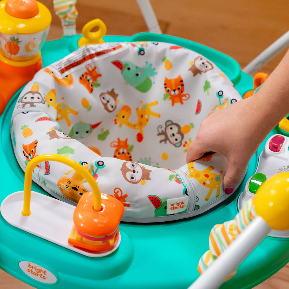 Seat rotates 360° for easy access to all the activities while baby jumps and plays; machine washable seat pad is easy to remove; wipe toys clean with mild soap and water