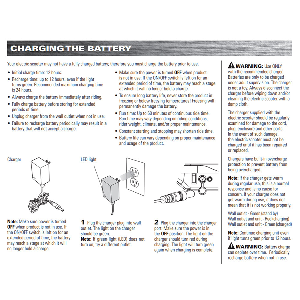 Rechargeable 12V sealed lead-acid battery provides an extended ride time of up to 65 minutes of continuous use