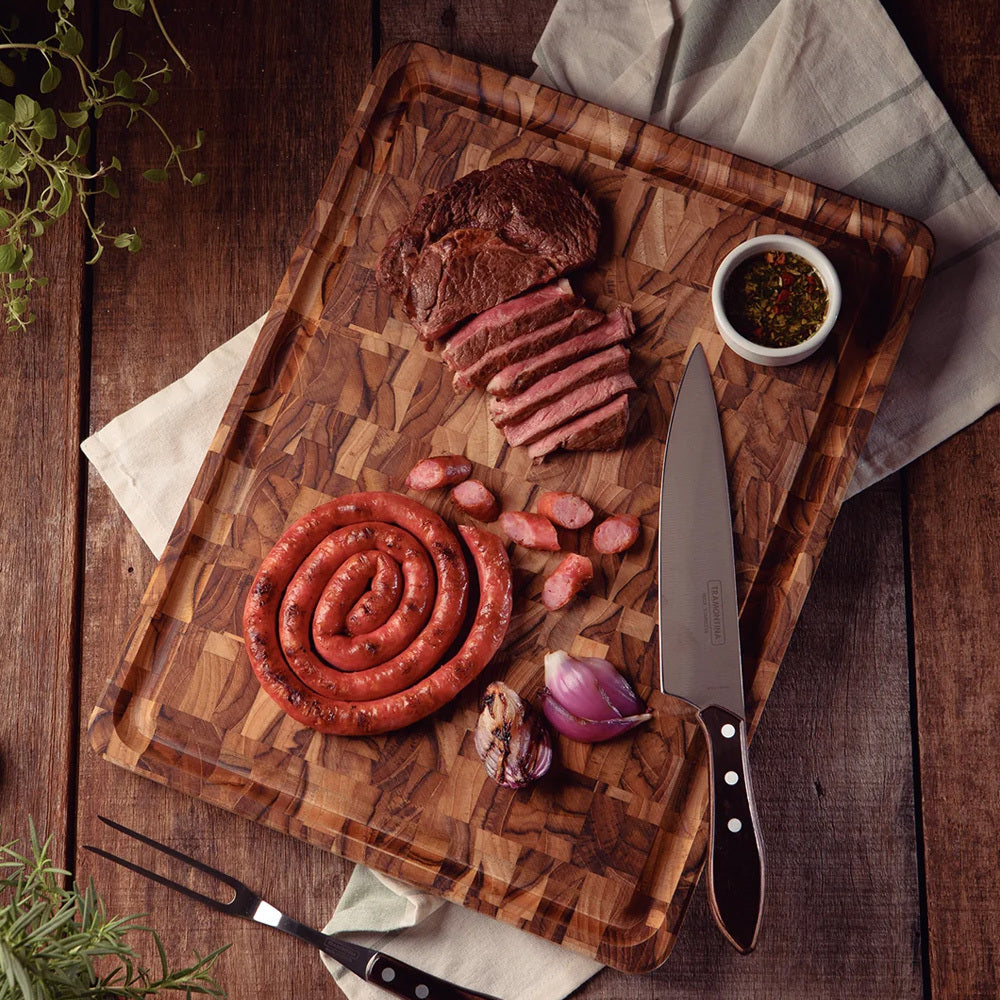 The Tramontina Rectangular Cube End Grain Barbecue Board in FSC Tropical Wood with Mineral Oil Finish. From the Churrasco line is perfect to be part of that celebration when serving the barbecue. The piece is produced in inverted wood that brings all the beauty and quality of Tramontina products.