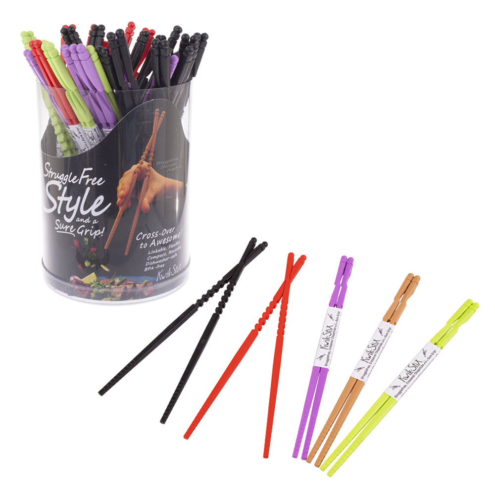 Stylish, struggle-free chopsticks with a sure grip! Kwik-Stix are easy to use, linkable training chopsticks. Great for both kids and adults, look sharp while you learn. Pinch & click to link, untwist to separate for compact portability and storage. Mix and match colours to suit the occasion or your mood. Now everyone can have fun, build skills, and dine with Confidence.Fast, flexible, fun and fashionable!