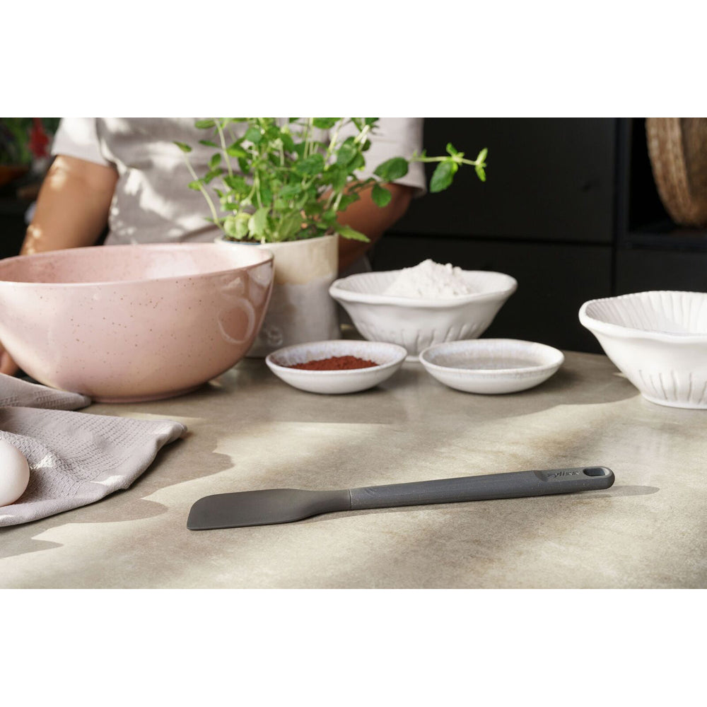 The Zyliss small Spatula is the perfect kitchen utensil. The "" handle is made of 50% wheat straw. This renewable raw material reduces the need for virgin plastics. The head is made of heat resistant silicone whilst the handle features a matt finish to provide a steady grip. The Spatula is ideal for scrapping cake mixtures, getting into jars with narrow openings etc making it an essential kitchen item