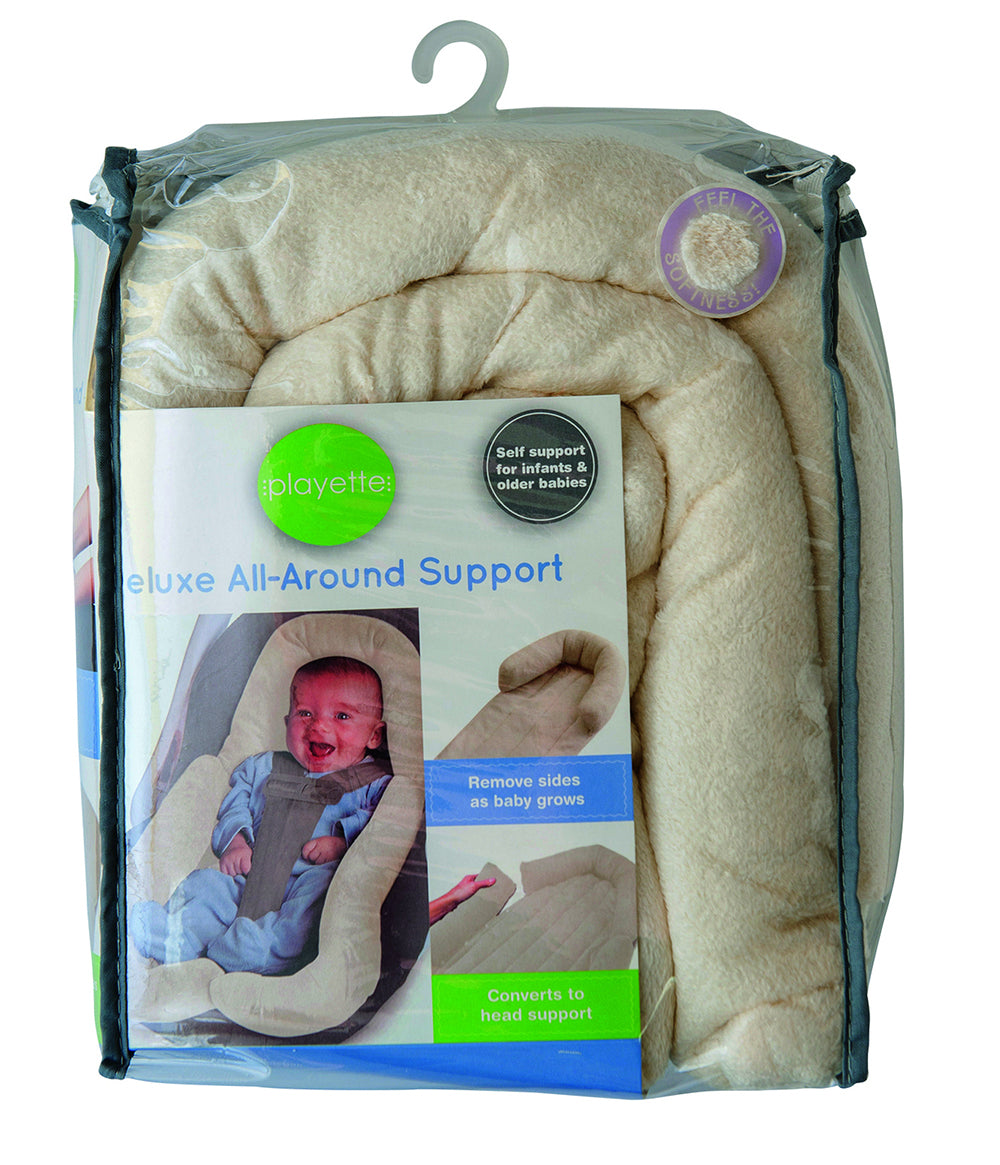 New Deluxe All Around Support with Extra soft Velboa plush padding for all-around support. Belt slots snaps for secure fit. Unsnap sides to form head support for older baby.