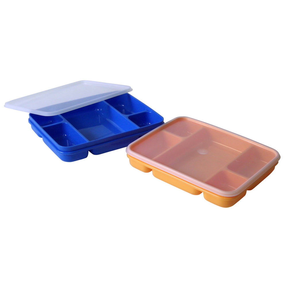 Five different compartments. Great for fruit, veggies, cheeses and dips. Perfect for parties and picnics or as a wrapper free lunchbox.