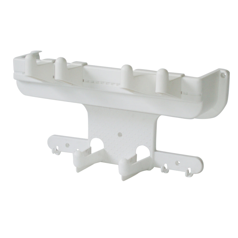 Sturdy plastic. All-in-one storage solution takes care of vacuum hose, broom, mop and more. Self-adhesive pads and screw mount included. Available in white.