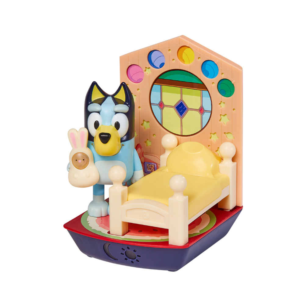 Bluey is ready to say goodnight and go to sleep in her own sweet little bedroom. Place Bluey into bed to magically illuminate a warm glowing Nightlight that fades out after 10 minutes. Your child will love to drift off to the Bluey's soft glow.