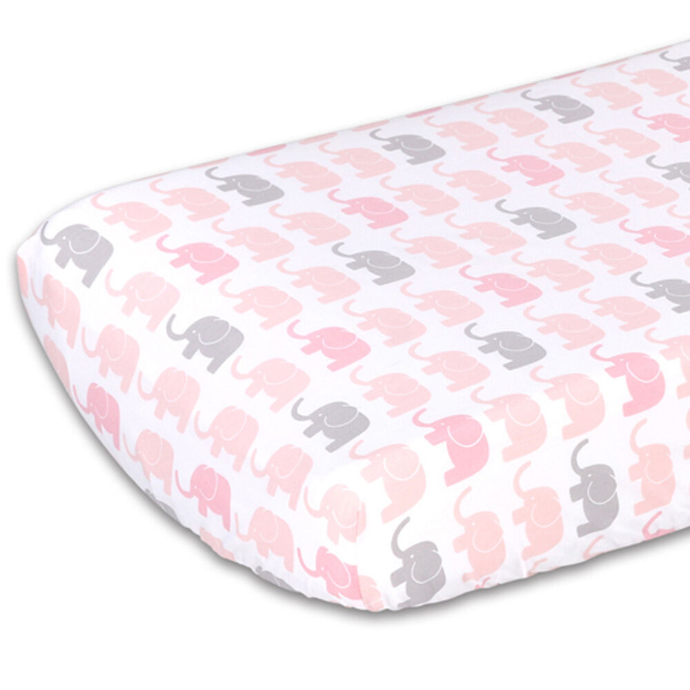 Celebrate with the playful pachyderms in this safari-inspired Sweet Peanut Bassinet 2 pack Sheet Set from The Peanut Shell. One sheet features an all-over print of marching elephants, trunk to tail, in shades of grey and pink on a crisp white ground. The second print featured detailed medallions and pink elephants on white. Both in 100% cotton sateen. The perfect pairing with the Sweet Peanut collection, and two sheets will allow you to always have an extra sheet on hand for quick changes. Perfect to send your little one off to sleep, dreaming of adventures out on the savannah.