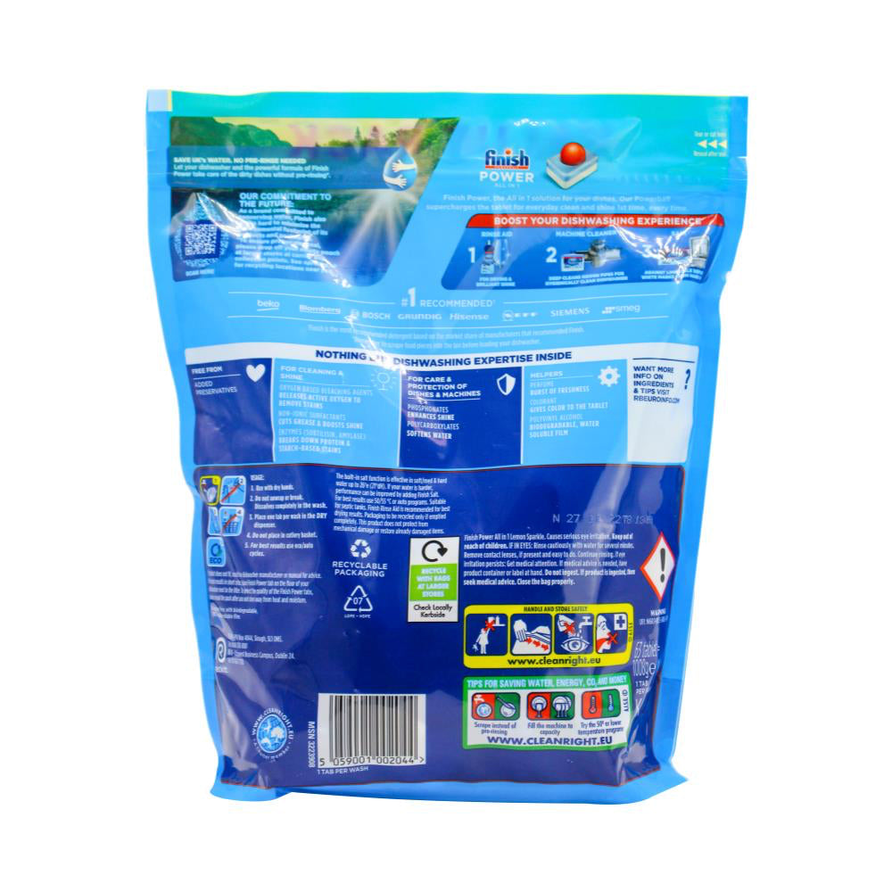 Our Finish Power All in One dishwashing tablets cuts through 24hr dried-on stains effectively without having to pre-rinse or soak your dishes. The lemon fragrance adds a burst of freshness to every wash. Finish Power All in One tablets are wrapper free, with water-soluble film.