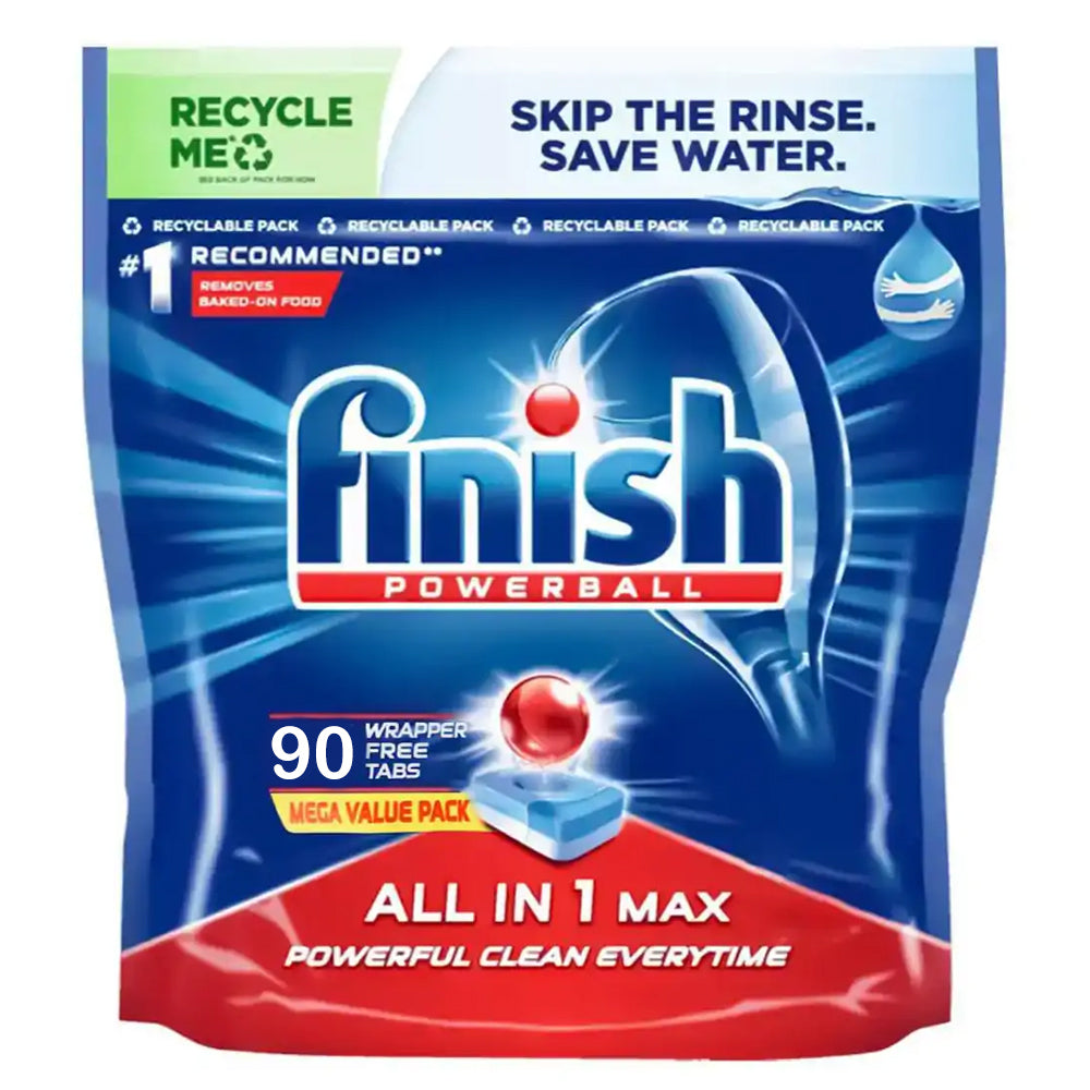 Finish Powerball All In 1 Max Dishwasher Tablets 90 Pack. Our Powerball boosts the tablet to remove baked-on food, giving you a deep clean every day. Wrapper free tabs.