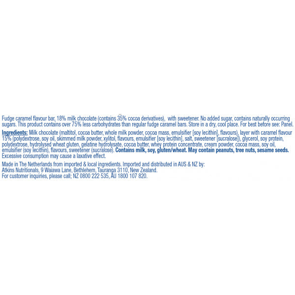 The Atkins Fudge Caramel bar is a delicious protein bar made with a soft fudge filling, creamy caramel layer and covered in rich milk chocolate. Packed with 15 grams of protein and less than 3 grams of carbs per bar, this bar is the perfect balance of indulgence and protein! Try microwaving for 20 seconds for a gooey fudgey dessert.