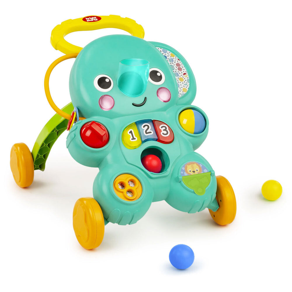 Sit-and-play or push-and-walk with the Stroll ‘n Roll ball play walker from Bright Starts! This 2-in-1 walker toy grows with your child’s development to bring your family years of joy. When used as a floor toy, there are so many activities to capture your baby’s attention. Get ready to have a ball with the interactive elephant trunk ball drop! Baby will practice fine motor skills by dropping balls into the elephant’s trunk, activating lights and sounds. The large easy-to-press piano keys count to 1, 2, 3 with push & play silly sounds and color introduction. Peek-a-boo! Spin the multicolored ball for a fun surprise. Or flip & see hidden safari friends. The movable bead ladder, dial toy and spinning ratchet toy encourage fine motor skills. Dance along to the 70+ songs, sounds and sayings in 3 languages. As baby grows, this sit-and-play toy doubles as a push toy! Practice early walking with more pep in every step. You’ll know your baby is stretching in new ways… they’ll just know they’re having fun! Power the joy with 3 AA batteries (not included).