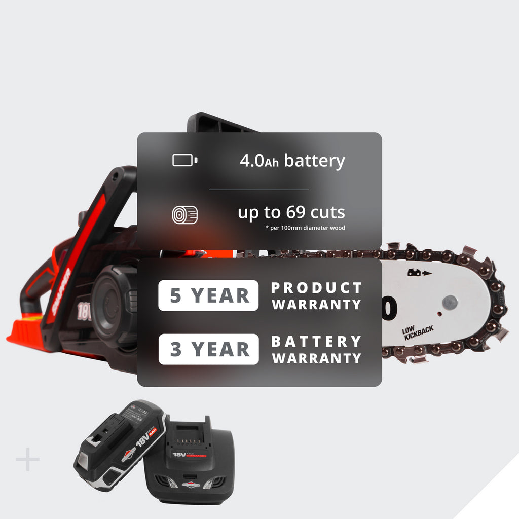 Powered by a Briggs & Stratton 18V 4.0Ah Lithium-Ion Battery the Snapper cordless chainsaw is capable of up to 69 cuts (of 100mm diameter wood) on a single charge from its powerful 600W motor. Paired perfectly with the world-class quality Oregon low kickback 10" chainsaw bar and chamfer chisel chain guaranteed to deliver a smooth and even cut. For added safety the Inertia activated chain brake stops chain rotation during any kickback. Ideal for small to medium tree cuts, firewood, and lopping easy to reach branches. Handy for camping, caravanning expeditions, its portable nature means you can take it on any adventures. Included with the mower is 1 battery and a charger which means you have everything needed in this kit to get the job done.