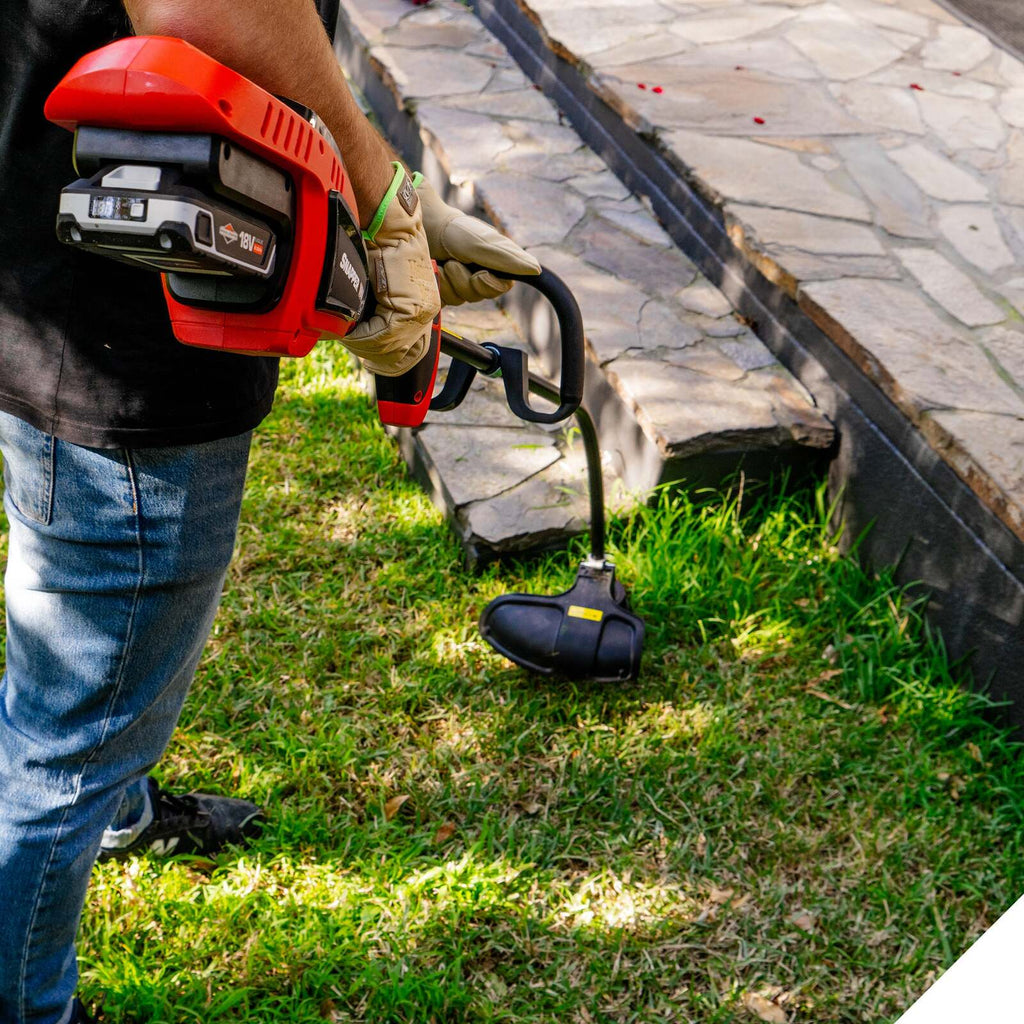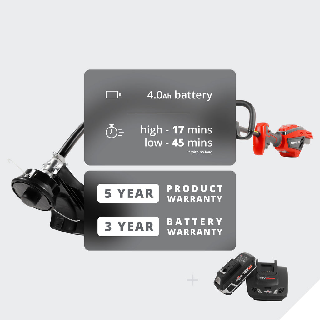 Powered by a Briggs & Stratton18V 4.0Ah Lithium-Ion Battery it is the perfect line trimmer for larger areas which have a lot of edges and fence lines. With up to 45 mins runtime on a single charge, and its wide 330mm cutting width, its bent shaft design is balanced to handle big jobs comfortably and fast. It's powerful two speed Brushless Motor with Load Sensing Technology gives longer life, low noise & high class performance.