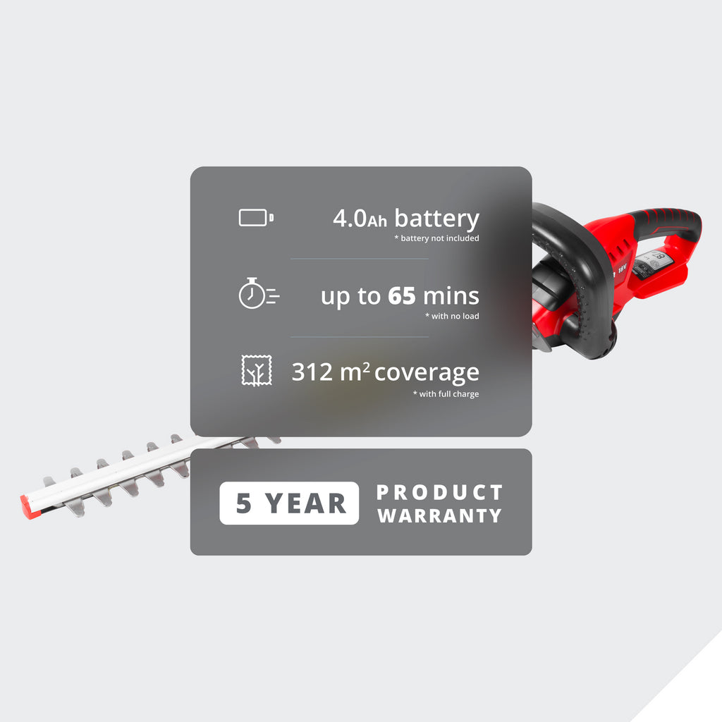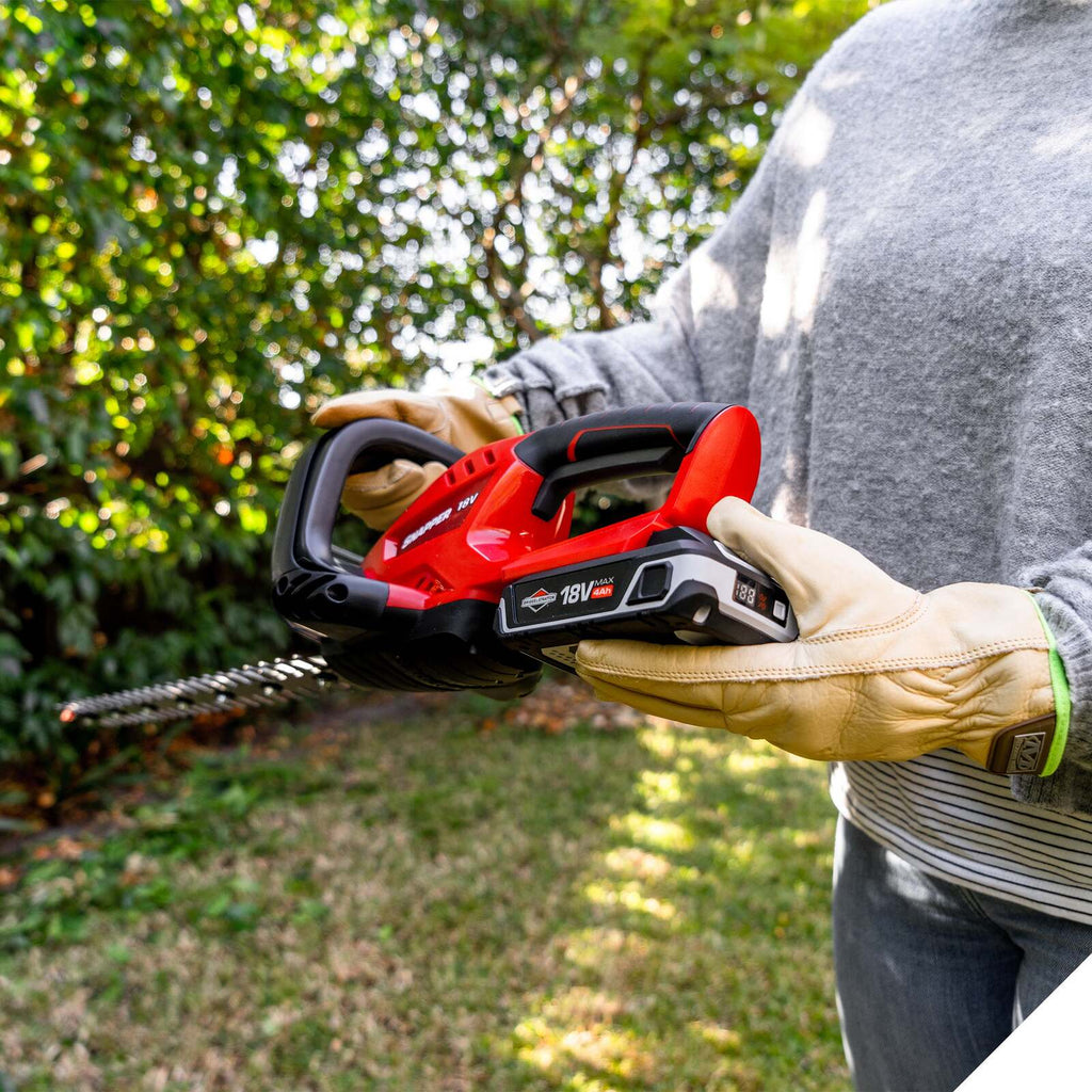 Powered by Briggs & Stratton 18V Lithium-Ion Batteries (available separately), the lightweight and ergonomically designed Snapper Hedge Trimmer is ideal for yards with small to large hedges, covering approx 312m² (up to 65 mins runtime) on a single charge. It comes with a long 58cm double sheer action steel cutting blades that can cut up to a max of 16mm thick branches. With wrap around handle design for maximum comfort and control whilst trimming in either horizontal or vertical positions.