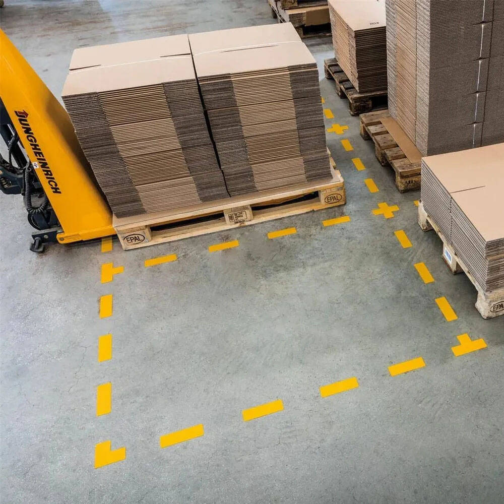 Floor marking for the identification of dangerous areas, storage spaces, walkways etc.