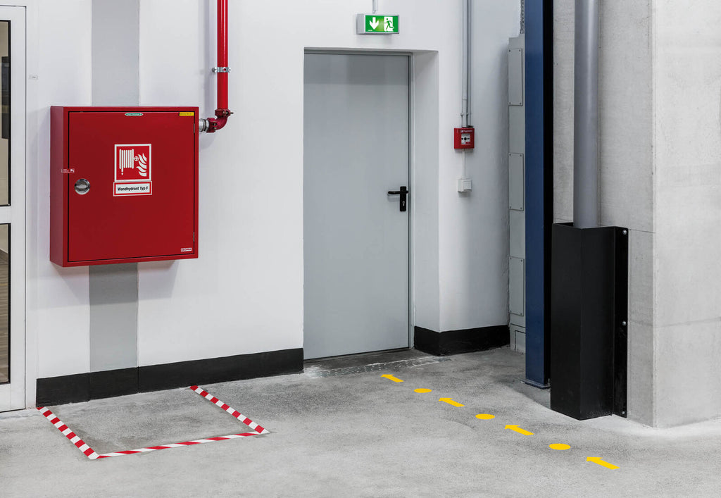 Self-adhesive floor marking in point shape for the identification of dangerous areas, storage spaces, walkways etc.