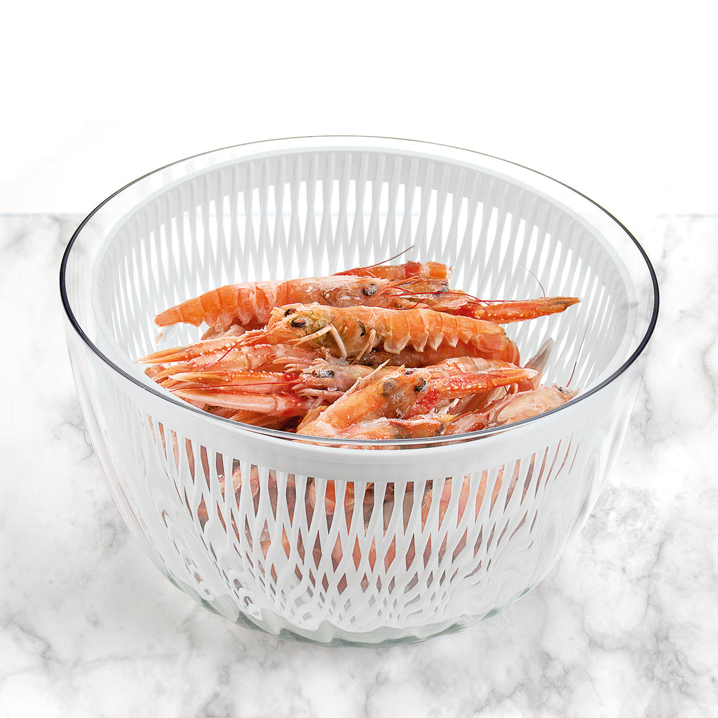 Spin&Store salad spinner washes and dries salad greens and all large-leaf vegetables quickly and effectively. Its compact container can also become an elegant salad bowl for use on the table. The internal basket has feet to keep it raised above the base of the container: thanks to this detail, the spinner can also be used as a container for defrosting foods, which are not immersed in water thanks to the feet which raise them off the bottom. The spinner also has a stay-fresh lid which can be fitted to the container for storing vegetables in the fridge.