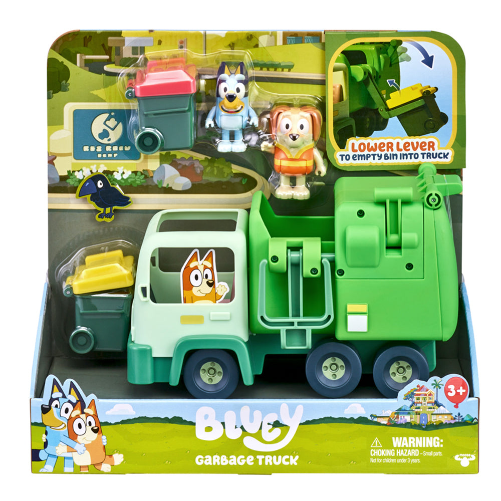 It's Bin Night at Bluey's place! Now you can help Bluey and the Bin Man collect the rubbish in his Garbage Truck. The Bluey Garbage Truck Playset comes with a 2.5" Figure of Bluey and the Bin Man.