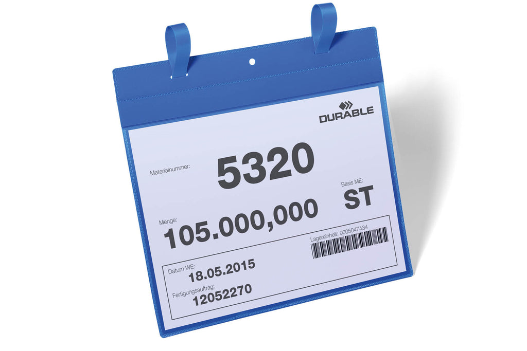 Pocket with arrow-shaped straps which fasten through the slot in the pocket. Ideal for permanent use in warehouse. Securely fastens on moveable transport containers, such as meshed containers. Even with strong movement, the pocket remains in place.