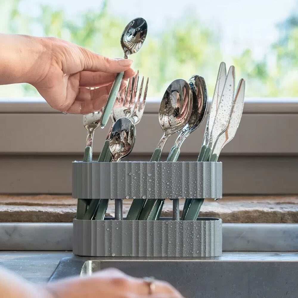 Practical, compact cutlery drainer with six compartments and two different heights, to help you to keep different types of cutlery separate. The integral dish collects the surplus water. Easy to clean, dishwasher friendly and can be completely dismantled into three pieces. Made from antibacterial plastic which reduces bacteria proliferation, by recycling 2.3 100% post-consumer disposable plastic detergent bottles.