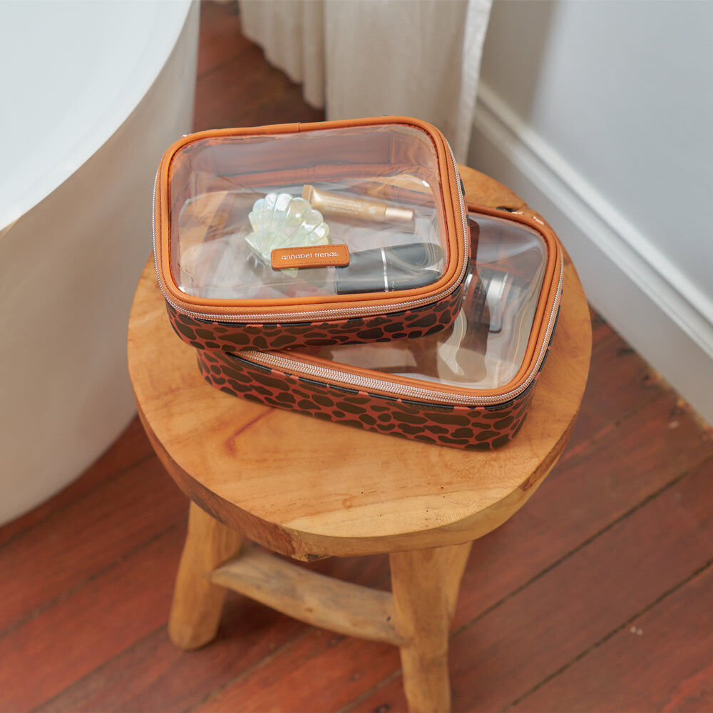 Classic and stylish designs are right on trend and this tan or spot faux leather Vanity Beauty Box set is sure to delight. Features two compact sizes in the set to suit all your beauty or toiletry needs. Both sized boxes have a clear see-through top and bottom, so even the smallest of items can be easily found. Bonus! Luxe rose gold zippers and logo complete the look.