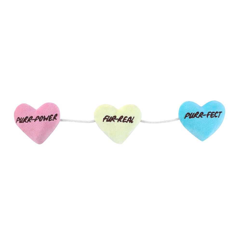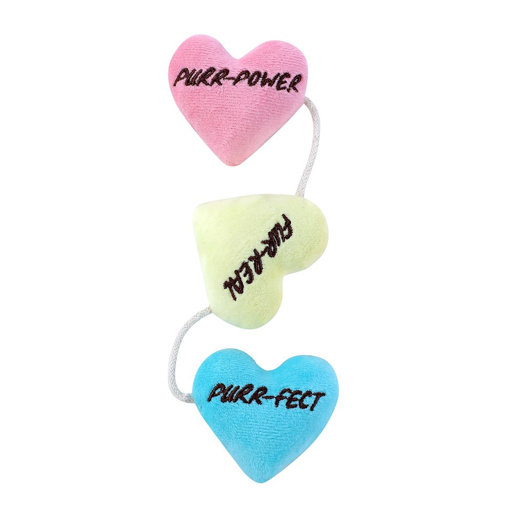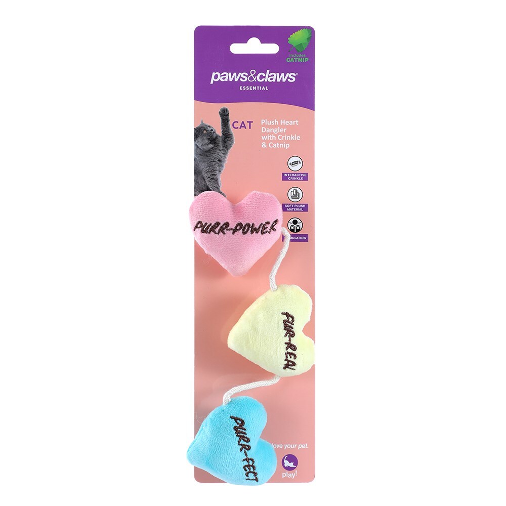 Your cat will love our Paws & Claws Plush Hearts Dangler With Crinkle And Catnip Cat Toys! Our design features soft colours, durable embroidery, interactive crinkle and super soft plush material that your cat will love to toss around and chase after all day long. Each heart is connected by a string so your cat will never lose them! Plus, catnip is included for extra stimulation.