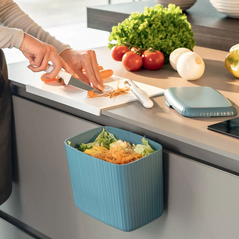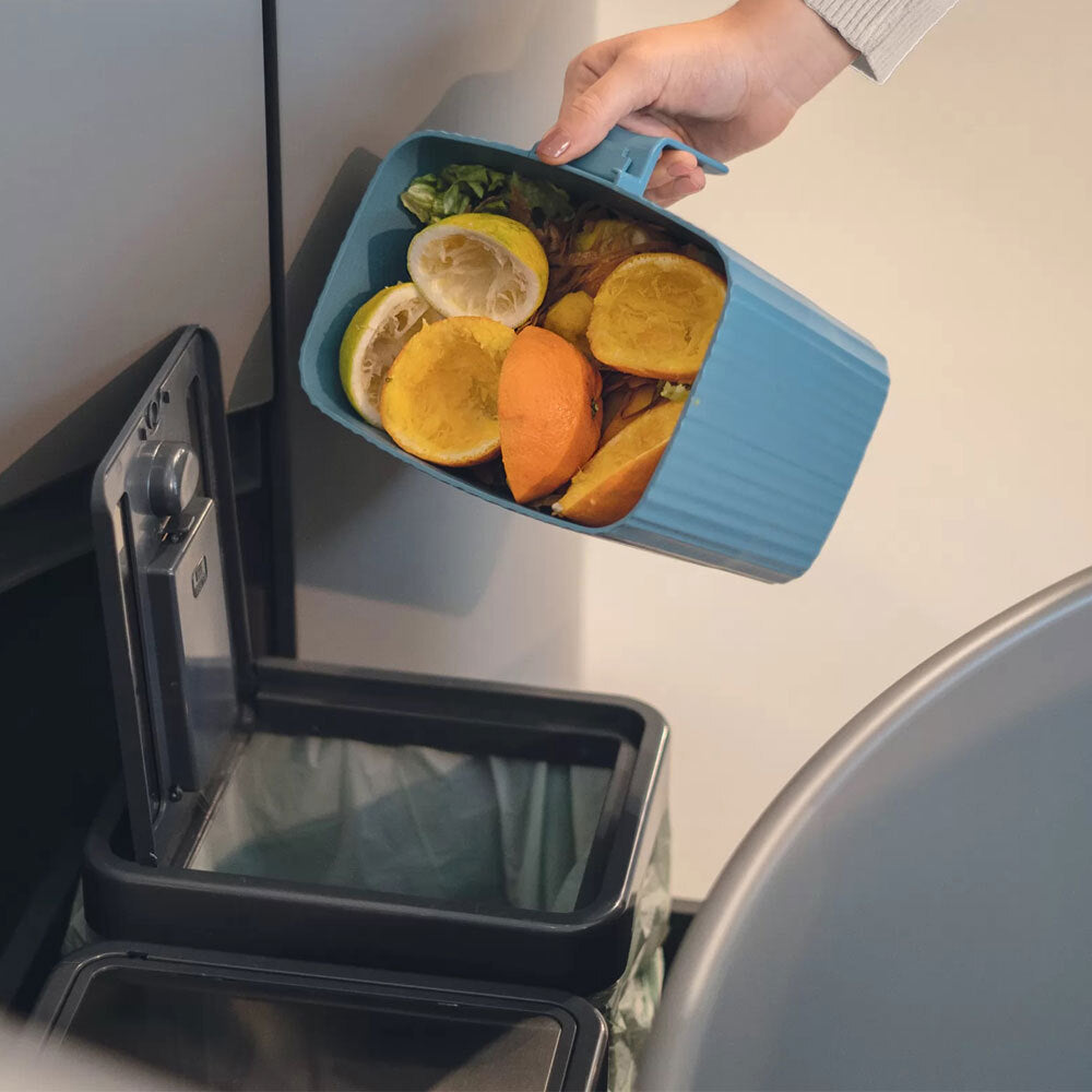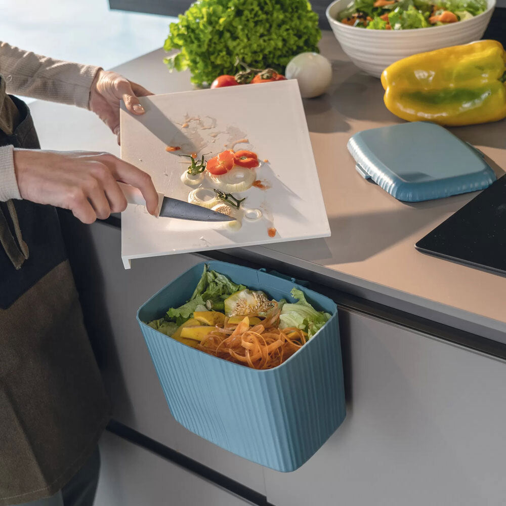 Food waste caddy, a container with lid to collect the organic and compostable waste produced during cooking, made from antibacterial plastic which reduces bacteria proliferation, by recycling 4.6 100% post-consumer disposable plastic detergent bottles. The food waste caddy has a completely removable lid that can be opened and closed with just one hand, and which can be kept vertical when in use to receive waste more easily. There is also a handy hook on the back for easy portability or for hanging the waste bin on a kitchen drawer or cabinet. Hand washable, it is really an excellent aid for people who like to keep their worktop clean while cooking.